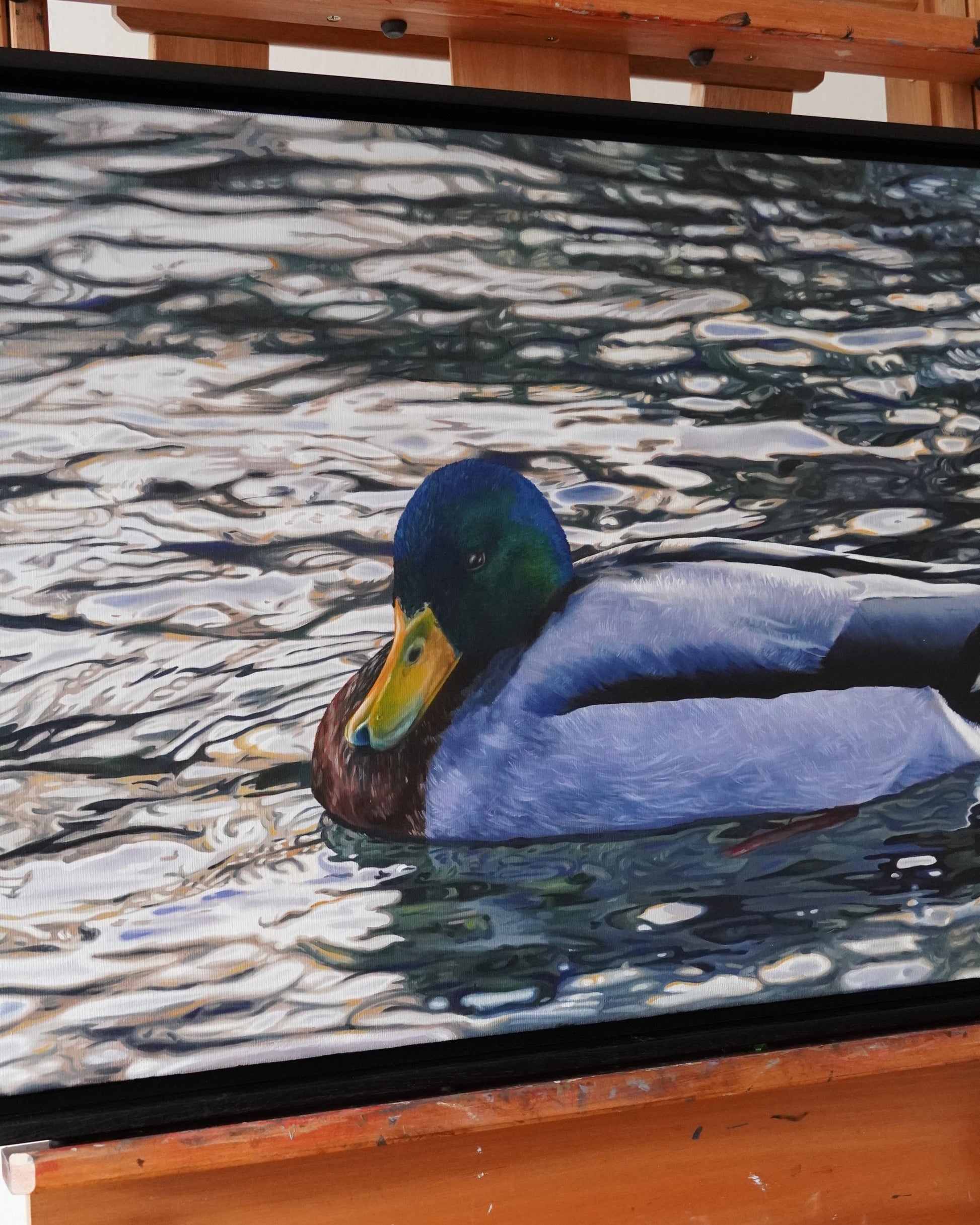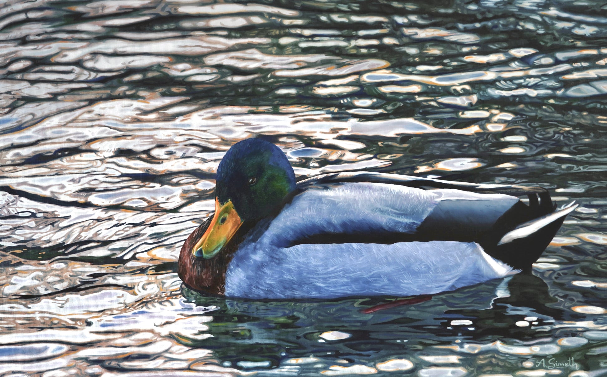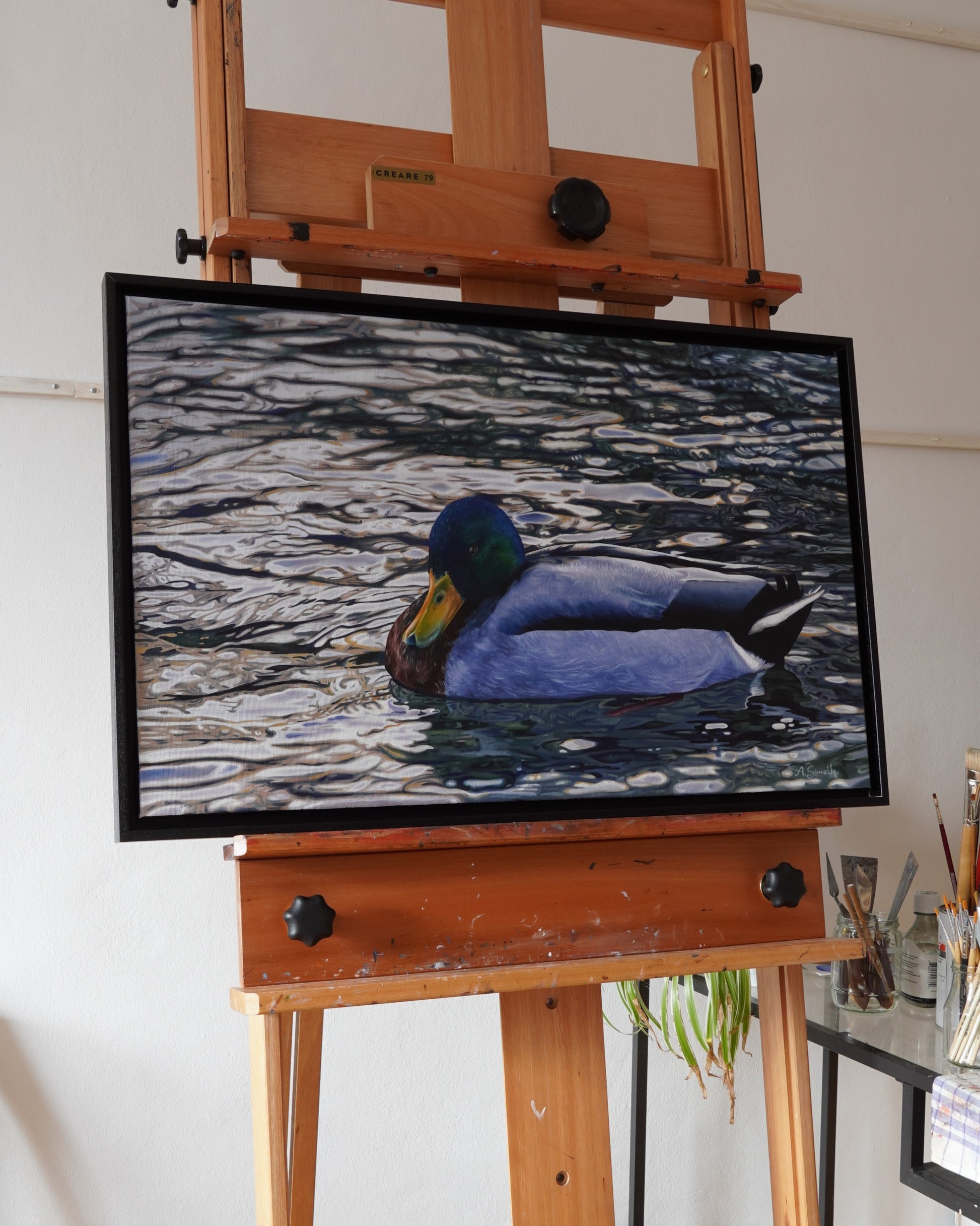 Please Don't Feed explores the beauty of a common animal like the mallard, surrounded by almost abstract watershapes. With this piece I intend to draw attention to the little wonders of life.