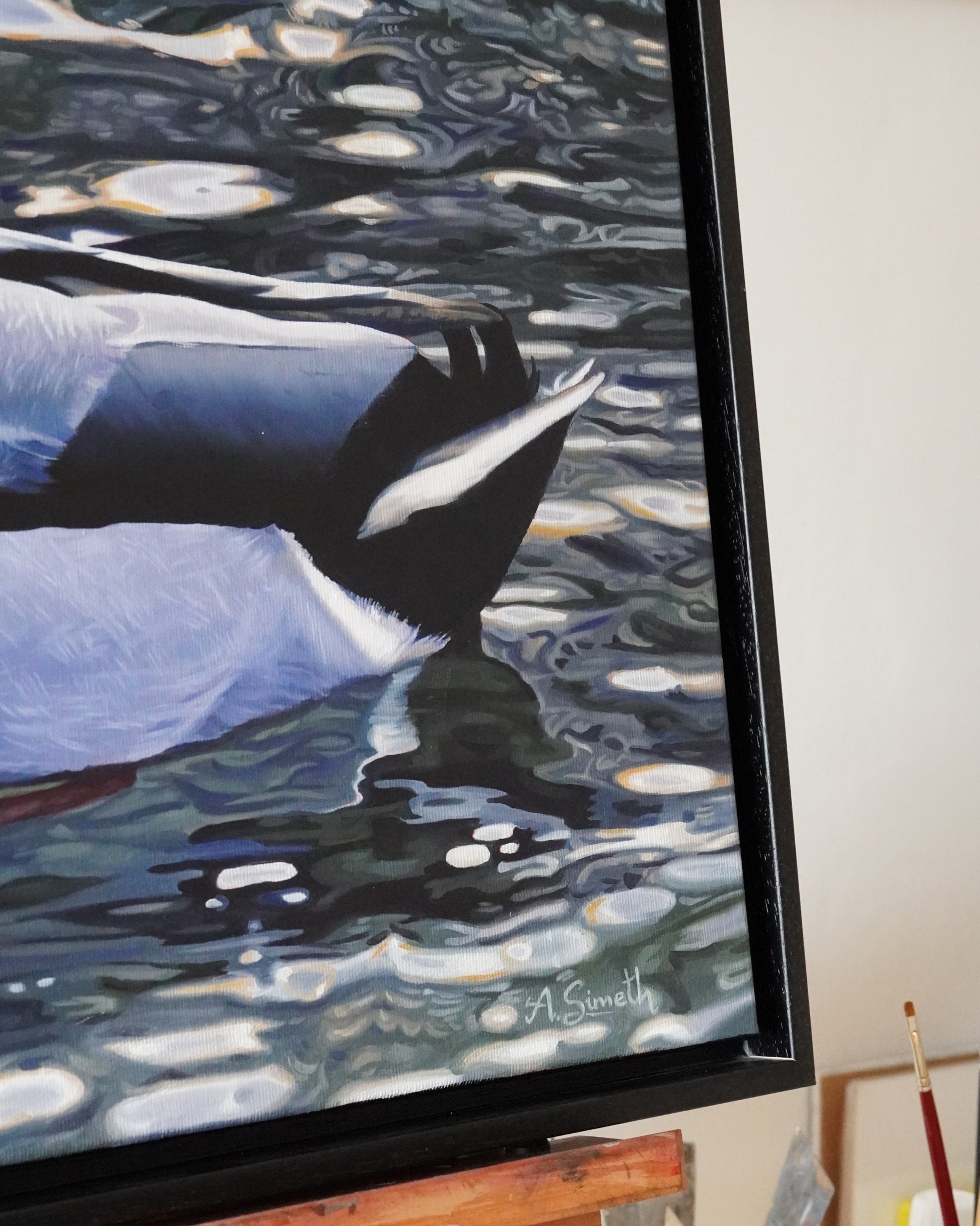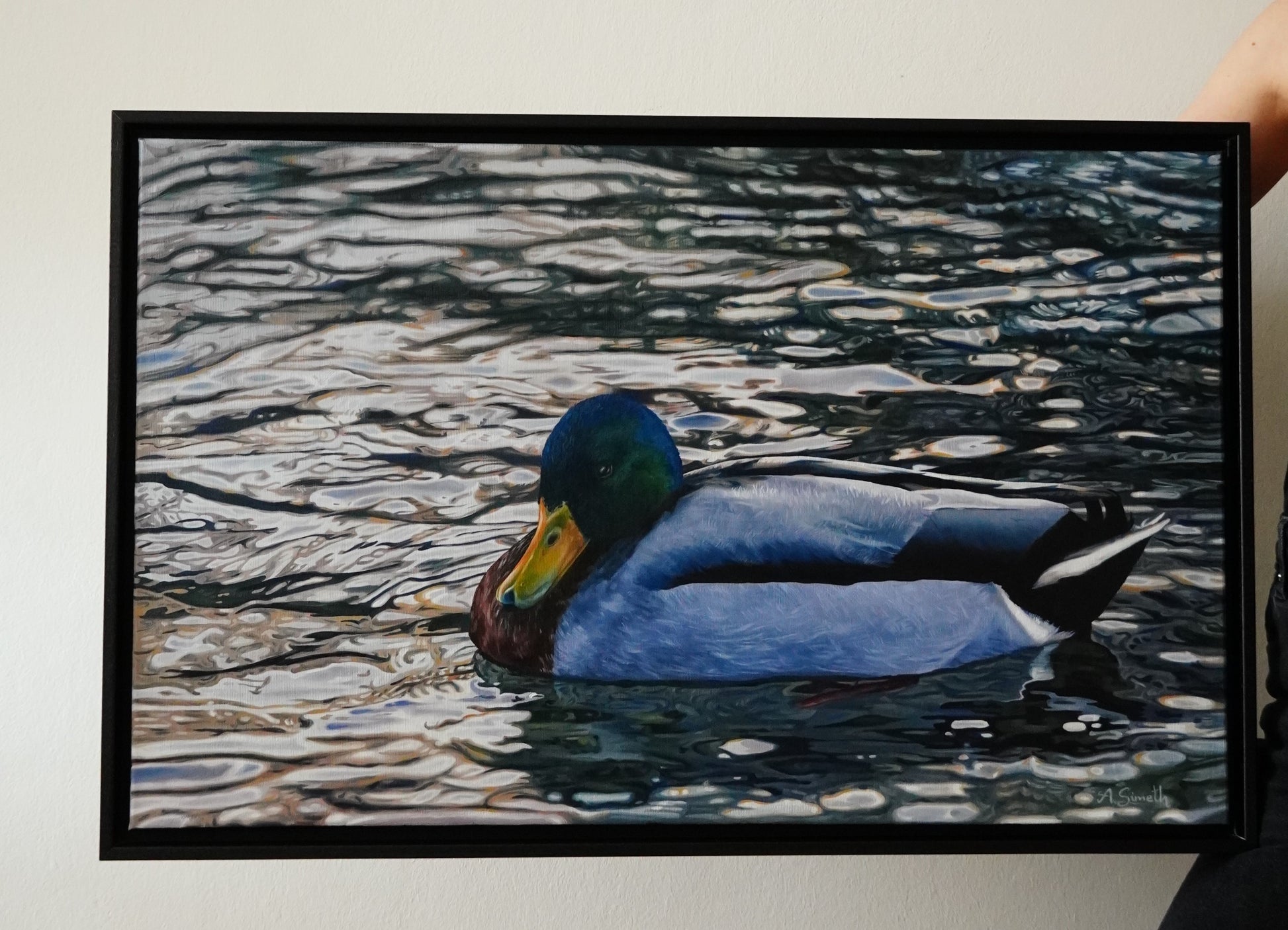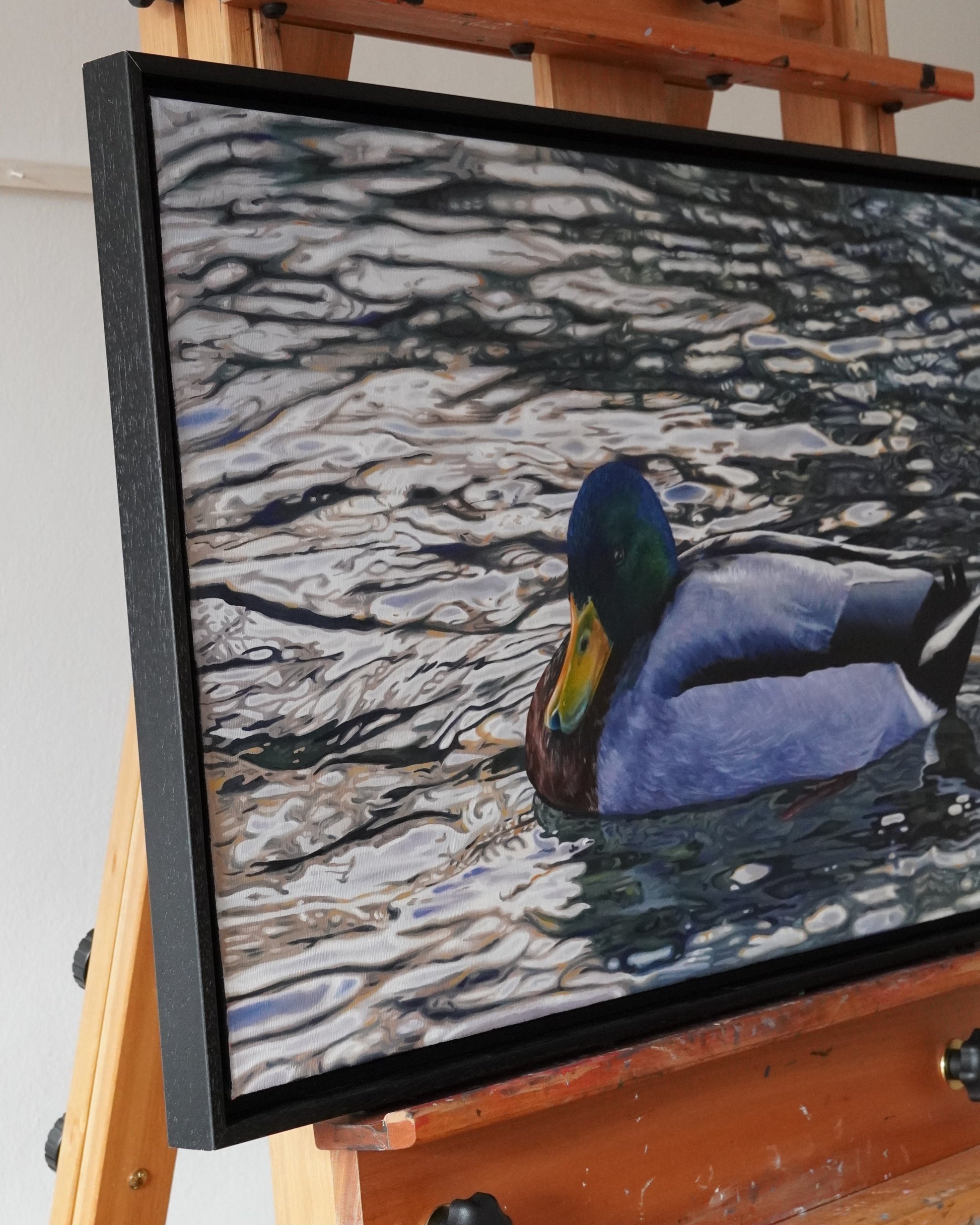 Please Don't Feed explores the beauty of a common animal like the mallard, surrounded by almost abstract watershapes. With this piece I intend to draw attention to the little wonders of life.
